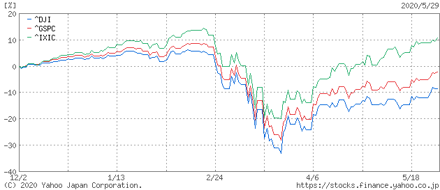 チャートを見ると好調な方からナスダック<IXIC>、S&P500<GSPC>、NYダウ<DJI>の順になっています。